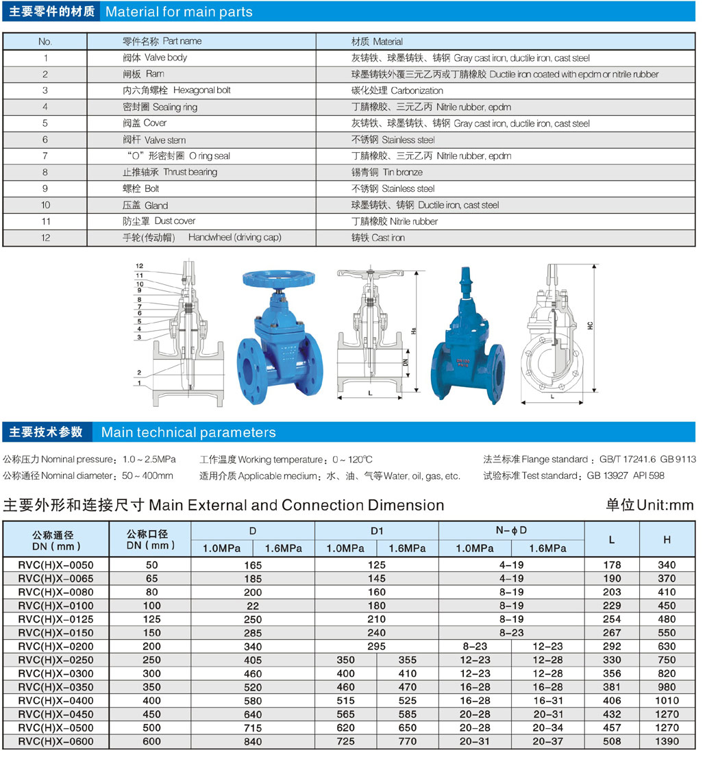 RVCX埋地式弹性座封闸阀由阀体、阀盖、阀杆、阀杆螺母、闸板等零件组成。此阀利用弹性闸板产生微量弹性变形的补偿作用达到良好的密封效果,该阀具有开关轻巧、密封可靠、弹性记忆佳及使用寿命长等显著优点,采用全通径,暗杆操作,法兰螺栓连接,平底式阀座,无杂物沉淀。广泛用于自来水、污水、建筑、石油、化工、食品、医药、轻纺、电力、船舶、冶金、能源系统等流体管线上作为调节和截流装置使用。